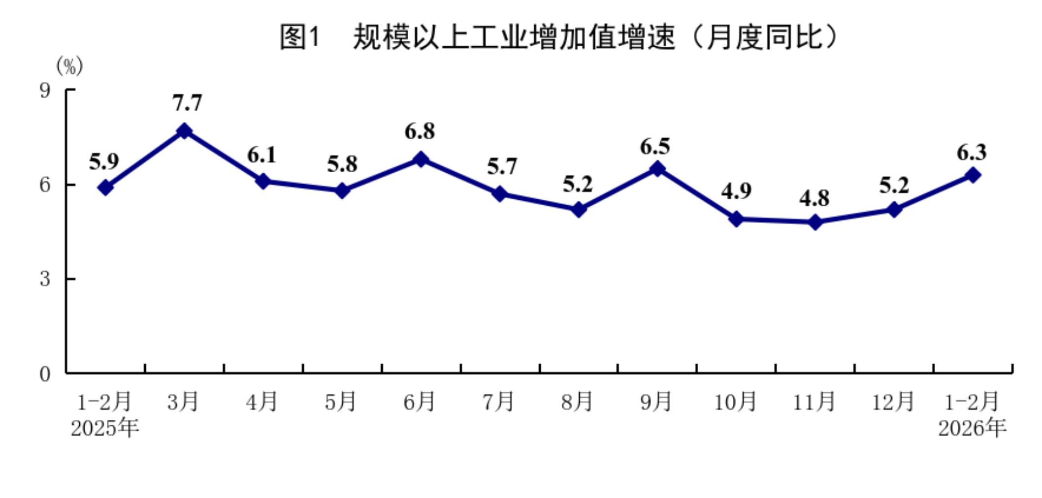 1—2月份,全国规模以上工业增加值同比增长6.3%,比上年12月份加快1.1个百分点。分三大门类看,采矿业增加值同比增长6.1%,制造业增长6.6%,电力、热力、燃气及水生产和供应业增长4.7%。装备制造业增加值同比增长9.3%,高技术制造业增加值增长13.1%,分别快于全部规模以上工业增加值3.0和6.8个百分点。分经济类型看,国有控股企业增加值同比增长4.2%;股份制企业增长6.9%,外商及港澳台投资企业增长4.0%;私营企业增长7.4%。分产品看,3D打印设备、锂离子电池、工业机器人产品产量同比分别增长54.1%、42.6%、31.1%。从环比看,2月份规模以上工业增加值比上月增长0.83%。2月份,制造业采购经理指数为49.0%;企业生产经营活动预期指数为53.2%,比上月上升0.6个百分点。
