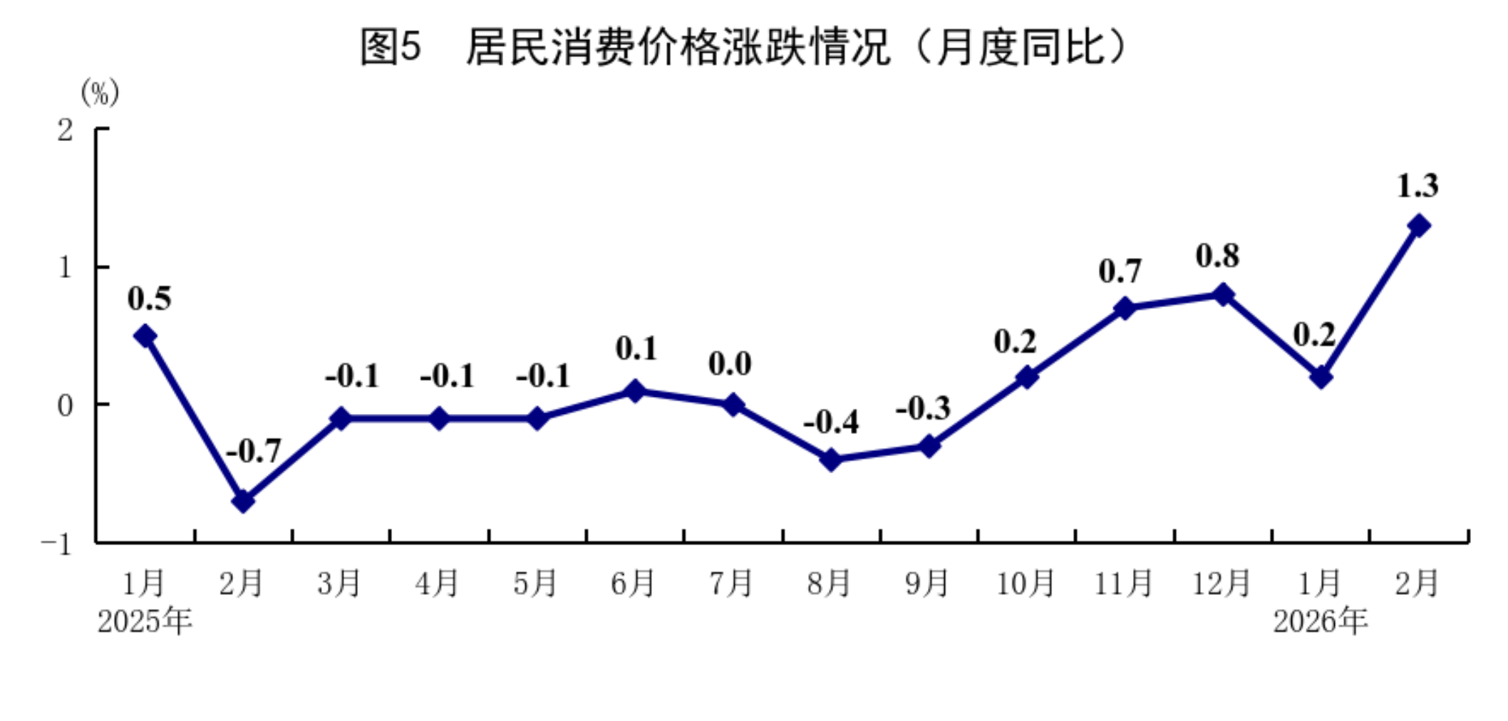 1—2月份,全国居民消费价格(CPI)同比上涨0.8%,其中1月份上涨0.2%,2月份上涨1.3%。分类别看,1—2月份,食品烟酒及在外餐饮价格同比上涨0.6%,衣着价格上涨1.9%,居住价格下降0.1%,生活用品及服务价格上涨2.7%,交通通信价格下降2.1%,教育文化娱乐价格上涨1.0%,医疗保健价格上涨1.8%,其他用品及服务价格上涨14.3%。在食品烟酒及在外餐饮价格中,猪肉价格下降11.2%,粮食价格下降0.2%,鲜果价格上涨4.5%,鲜菜价格上涨8.8%。扣除食品和能源价格后的核心CPI同比上涨1.3%。从环比看,1月份,全国居民消费价格上涨0.2%,2月份上涨1.0%。